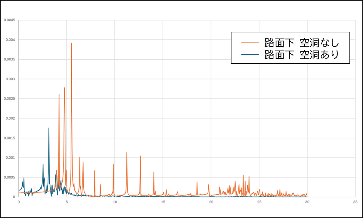 路面下に比較的大きな空洞があると、固有振動数が低くなる傾向にあることが文献等で確認できます。